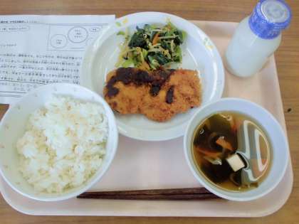 今日は、ごはん、牛乳、みそかつ、野菜のレモンじょうゆかけ、若竹汁です。