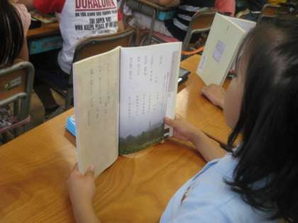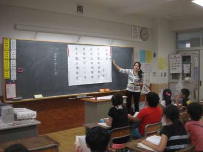 3年2組の担任は、川和教諭です。教科「日本語」の授業でした。漢詩の「江南の春」です。暗唱するのが好きな子供たち。声を出しながらしっかり覚えていました。2年生の時より、ずっと成長しています。