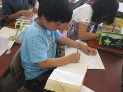4年2組の担任は、益村教諭です。国語の説明文の読解の授業でした。わからない言葉の意味を調べ、文章を読み取っていきます。辞書の引き方、文章の読み取りの基礎基本を学んでいます。意欲的な姿が表れていました。