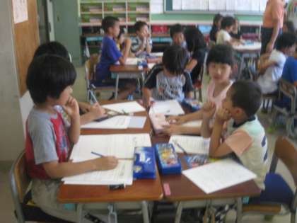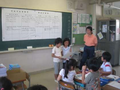 2年5組の担任は、中村淳子教諭です。生活科の授業でした。自分が世話をしている野菜ごとに分かれて、世話の仕方で困ったことを解決する方法を考えます。グループでの話し合いがとても上手なことに感心しました。