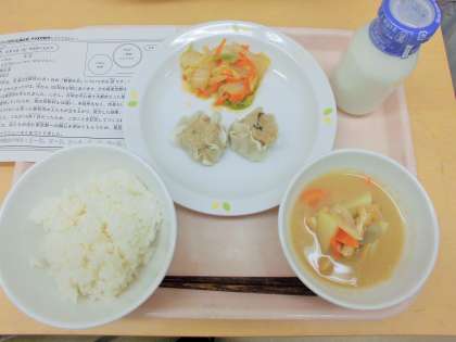 今日は、ごはん、牛乳、とびうおシューマイ、辣白菜(ラーパーツァイ)、五目汁です。