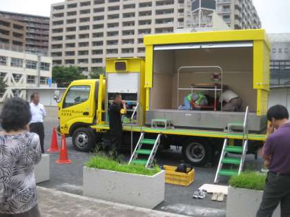災害が起きた時、塚戸小学校は、地域の避難所になります。塚戸小の避難所を運営するのは、祖師谷千歳台自治会の方々です。今日は、その避難所の開設訓練を行いました。学校の裏には防災倉庫があります。