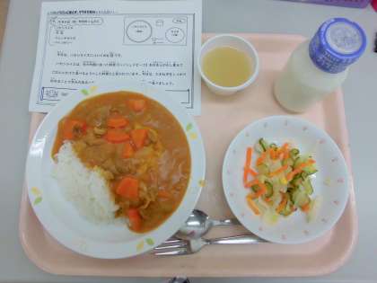 ハヤシライスは、元々外国にあった料理『ハッシュドビーフ』を日本人が少し変えてご飯にかけて食べるようにした料理だといわれています。今日は、玉ねぎをしっかり炒めることでコクと甘みのあるハヤシライスに仕上げました。よく噛んで食べましょう。
