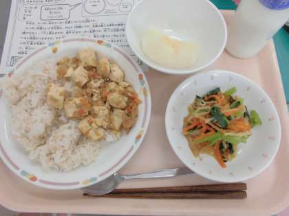 今日は、マーボー丼、牛乳、ナムル、梨です。