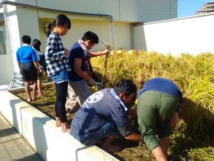 1学期に屋上に植えた稲が実りを迎えました。地域・保護者の方々に教えていただきながら、5年生が鎌を使って丁寧に稲をかりました。干されている稲の黄色と秋晴れの青色がコントラストがとてもきれいです。しばらく干した後、脱穀を行う予定です。地域・保護者の皆さま、ご多用の中ありがとうございました。