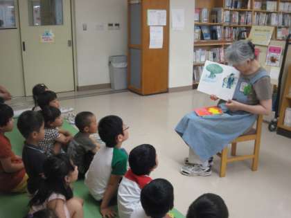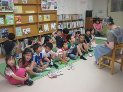 休み時間、図書室では、月に1回、どんぐりお話会の読み聞かせを行っています。やってきた子供たちは、真剣に聞いていました。お話を聞くのは楽しいね。