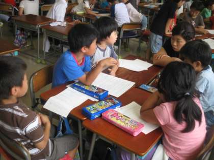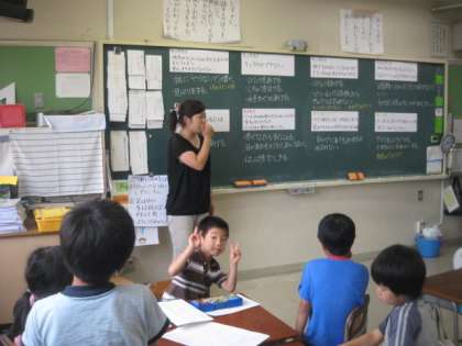 2年4組の担任は、真貝教諭です。生活科の授業でした。野菜の世話で、困ったことをどう解決するか、グループで話し合っていました。グループで話し合う活動が上手になってきた子供たちです。