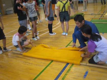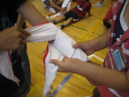 16時20分。防災実技訓練が始まりました。体育館では、止血方法、担架訓練を行っています。子供たちはやり方を覚えています。