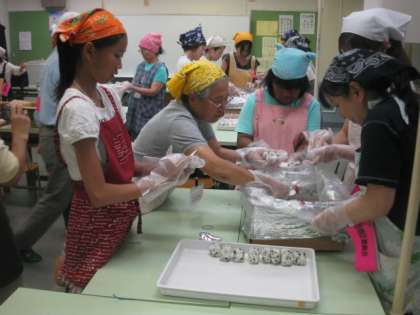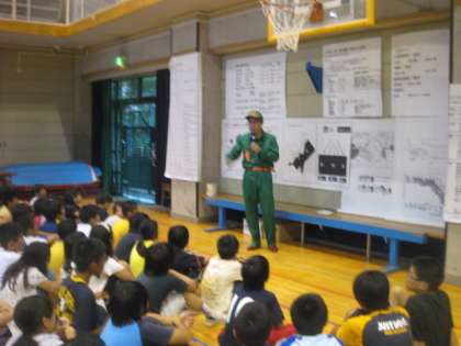 18時。防災実技訓練が終わったところで、雨になる。調度よかった。体育館では、地域の人による地震や災害の話を子供たちは聞いています。。家庭科室では、地域の方々や中学生のボランテァアが、アルファ米で夕食作りをしてくれています。。