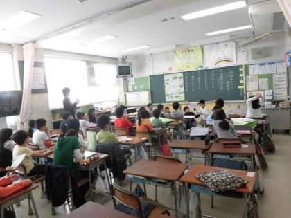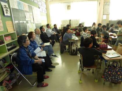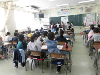 4年生が地域を調べて作った安全マップの発表を行っていました。「入りやすい見えにくい」をキーワードに、マップ上に示された危険なところや安全なところを互いに伝え合いました。地域調べに協力してくださったTAPをはじめとする地域の方々にも聞いていただきました。劇仕立てにするなど、各グループそれぞれが工夫をこらしていました。