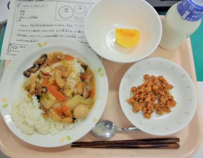 今日は、中華丼、牛乳、大豆とじゃこの甘辛揚げ、柿です。