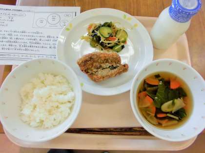 今日は、ごはん、牛乳、さばのインディアン揚げ、和風サラダ、根菜のすまし汁です。