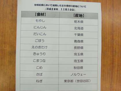 みなさんは、根菜とはどんなものか知っていますか。根菜とは、ねっこの「根」という字に野菜の「菜」と書きます。この字の通り、ねっこや地下(土の中)に埋まっている部分を食べる野菜を根菜といいます。今日の野菜では、にんじん、だいこん、ごぼうが根菜にあたります。根菜には、ビタミンやミネラルがたくさん詰まっていることから体を温める効果があるといわれているので、寒い今の季節にぴったりです。ぜひ、残さず食べて体の中から温まりましょう。