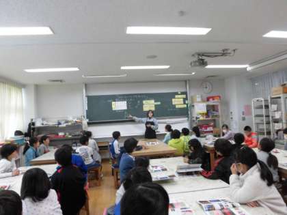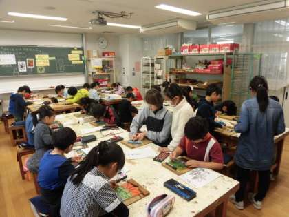 4年生は図工では、木版画に取り組んでいます。初めての彫刻刀ですが、緊張しながらも手先を上手に動かしながら、丁寧に木を彫っています。どんな版画に仕上がるか、楽しみですね。