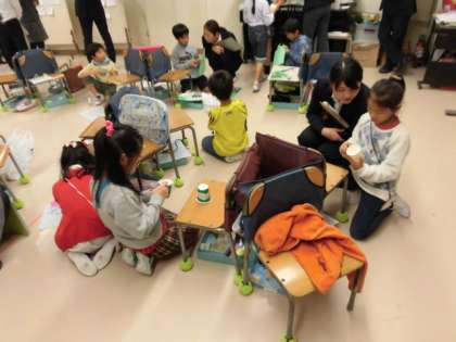 2年生の生活科では「動くおもちゃ作り」に取り組んでいます。「風の力」「磁石の力」「ゴムの力」のそれぞれのグループに分かれ、どうすればうまく動くのか、互いに教え合いながら、おもちゃを進化させていきます。おもちゃ作りをとおして、自然科学的なことに気づいたり、友達のかかわることのよさに気づいたりしていくことが、生活科の大切なねらいとなっています。