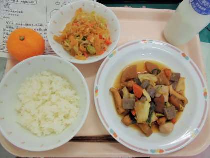 今日は、ごはん、牛乳、いかと大根のうま煮、ぱりぱりサラダ、みかんです。