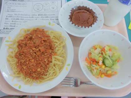 今日は、スパゲティーヘルシーミートソース、牛乳、キャベツサラダ、米粉と大豆粉のココアマフィンです。