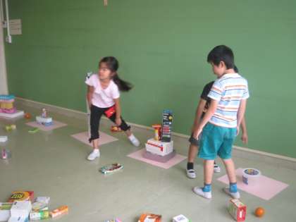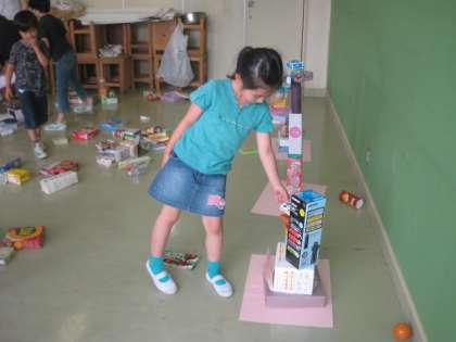 1年5組の担任は、佐藤教諭です。算数の「かたち」の授業でした。家から持ってきたいろいろな形の箱を高く積むゲームをしながら、どんな箱の形であれば高く積めるか考えます。子どもたちは、遊びながら、その秘密に気付いていきました。