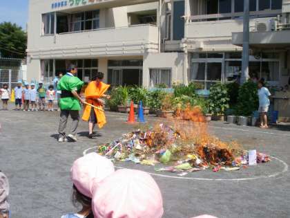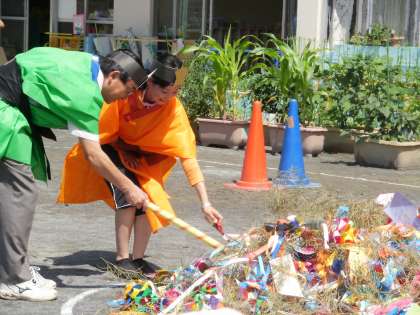 昨日、七夕でした。今日は、幼稚園で飾った笹や、家で飾った笹を持ってきて、願いがかなうように笹を焼きました。園長先生と新井先生が彦星と織姫になって、火をつけました。笹はあっという間に焼けました。願いがかなうといいね。