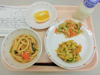 今日は、うどん、牛乳、冬野菜のかき揚げ、中華風ごまだれかけ、ネーブルです。