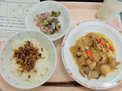 今日は、ごはん、牛乳、かみかみ佃煮、すき焼き煮、野菜のゆかりかけです。