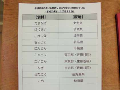 今日のすき焼き煮に使われている長ねぎとゆかりかけに使われている大根、キャベツは、北烏山にある浅野さんという農家の方が作って育てたものです。世田谷の子どもたちにとれたてで新鮮な野菜を食べさせてあげたいという思いで寒い冬にも毎日畑に出て、一生懸命野菜を育ててくれています。農家さんの思いを無駄にすることのないよう、よく味わっていただきましょう。
