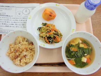 今日は、さんまごはん、牛乳、梅ドレッシングサラダ、ほうれん草のすまし汁、かきです。