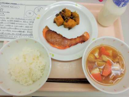 今日は、ごはん、牛乳、鮭のゆずみそ焼き、いとこ煮、けんちん汁です。