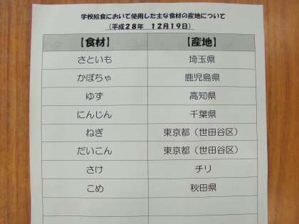 みなさん、明後日21日は何の日か知っていますか。21日は、冬至です。そこで今日は、ひとあし早い冬至献立です。冬至とは、先々週のぶりの照り焼きのときにお話した二十四節気のひとつで、一年で一番太陽が出ている時間が短い日です。この冬至の日には、かぼちゃを食べ、お風呂にゆずを浮かべたゆず湯に入って、体を内側と外側から温めると、風邪を引かず健康でいられるといわれています。そこで今日は、みなさんの健康を願い、魚のみぞだれにゆずの果汁と皮を、いとこ煮にかぼちゃを使っています。ぜひ、ゆずの香りやかぼちゃの甘みを感じてみてください。、