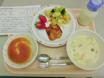 今日は、ミルクパン、牛乳、とり肉の照り焼き、花野菜サラダ、クリームシチュー、いちごです。