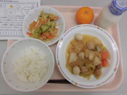 今日は、ごはん、牛乳、豚肉と大根のうま煮、パリパリサラダ、ポンカンです。