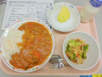 今日は、トマトのハヤシライス、牛乳、春雨サラダ、りんごです。