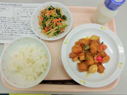 今日は、ごはん、牛乳、鱈の酢豚風、ごまあえです。