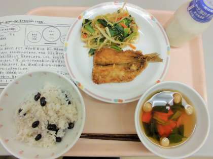 今日は、黒大豆ごはん、牛乳、鰯のかば焼き風、華風あえ、お麩入りすまし汁です。
