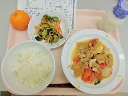 今日は、ごはん、牛乳、すき焼き煮、和風サラダ、ぽんかんです。
