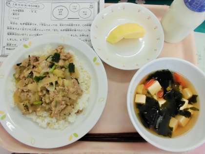 今日は、ねぎ塩豚丼、牛乳、若竹汁、りんごです。