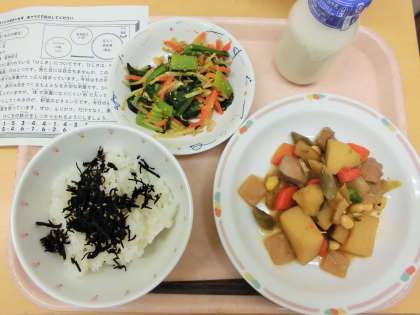 今日は、ごはん、ひじきのふりかけ、牛乳、五目うま煮、乾物あえです。