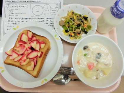 今日は、アップルトースト、牛乳、小松菜とウインナーのソテー、森のチャウダーです。