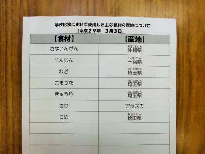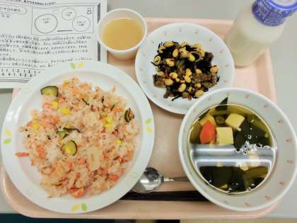 みなさん、今日3月3日は『桃の節句』で『ひな祭り』が行われる日です。ひな祭りは、女の子のすこやかな成長と幸せを願う日行事で、今から1200年以上も前から行われていたようです。このお祭りでは、お雛様を飾りますが、なぜかわかりますか。それは、お雛様が守り神の役割をして、女の子に降りかかる悪いことを代わりに受けてくれるといわれているからです。今日は、ひな祭り、桃の節句ということで鮭やコーン、きゅうりなどを使った色鮮やかな「さけずし」と「桃ゼリー」を取り入れました。ぜひ、残さず食べて幸せを願いましょう。