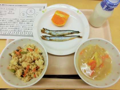 今日は、きのこごはん、牛乳、やきししゃも、白菜のみそ汁、せとかです。