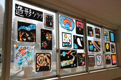 みなさん、ステンドグラスはご存じですか?もちろん知っていますね。では養生テープはご存じですか?様々な現場作業などで使われる、よくくっついて剥がれやすいテープです。実は透明度も高く、光に透かすととてもきれいなんです。そして最近、カラーバリエーションが豊富!これはステンドグラスのようなものを作れるのではないか?と思い、造形クラブの子たちに作ってもらいました。その名も『ステンドテープ』!