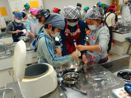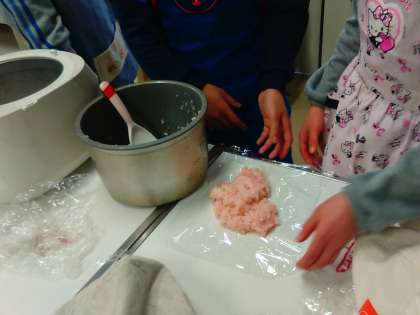 地域の方にご指導いただきながら、田植え・稲刈り・脱穀してきたもち米で5年生が調理をしています。こちらのクラスはさくら餅です。ふかしたもち米をすりつぶして、きれいに色づけし、あんこを入れれば完成です。食べてみれば・・・。「おいしい!」なかなかどうして玄人はだし。子どもたちは大満足でした。お米を育ててくださった、地域の皆さま、本当にありがとうございました。