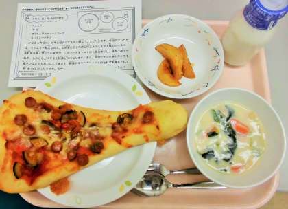 今日は、ナンピザ、牛乳、ほうれん草のクリームスープ、スパイシーポテトです。