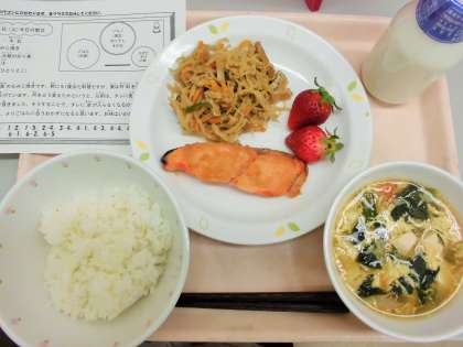 今日は、ごはん、牛乳、鮭のもみじ焼き、切り干し大根の炒り煮、かき玉汁、いちごです。