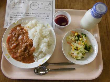 今日は、トマトのハヤシライス、牛乳、ブロッコリーのサラダ、ぶどうゼリーです。