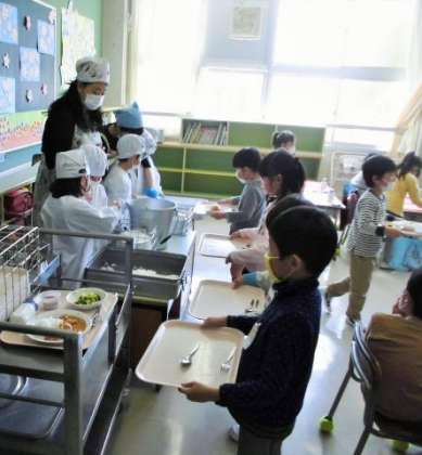 今日から約2週間、おひさまボランティアの方が、一年生各クラスに2名ずつ給食補助に入ってくださいます。今日も、児童にやさしく声をかけながら配膳の補助をしてくださいました。おかげさまで、初めての給食もスムーズに進み、食事の時間を充分にとることができました。