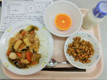今日は、中華丼、牛乳、大豆の甘辛揚げ、なつみです。