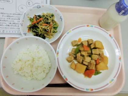 今日は、ごはん、牛乳、肉じゃがうま煮、乾物あえです。