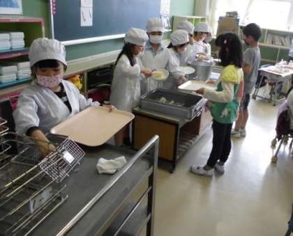 1年生は、おひさまボランティアの期間が終わり、自分たちだけの配膳になって約一週間。しゃもじやお玉、トングなどの使い方にもだいぶ慣れて、大人の手がなくでも自分たちだけで配膳ができるようになってきました。