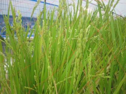 夏休みも後10日を残すのみとなりました。夏休みの間、屋上田んぼの稲も大分生長しました。花が咲き、実がつきました。地域の方が、ネットをはったり、害虫を取り除いたり、水の管理をしたりして、世話をしていただきたおかげです。順調に育っています。